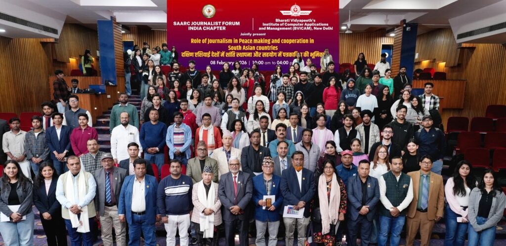 नयाॅ दिल्ली, २६ माघ । भारतको नई दिल्ली स्थित भारतीय विद्यापीठ र सार्क जर्नलिस्ट फोरम इण्डिया चाप्टरले आयोजना गरेको दक्षिण एसियाकाे शान्ति स्थापना र सहयोगमा पत्रकारिताको भूमिका बिषयक अन्तर्राष्ट्रिय सम्मेलनमा नेपाल, भारत, श्रीलङ्का, बङ्गलादेश, पाकिस्तान, भुटान, लगायतका देशबाट आएका पत्रकारहरु बिच बृहत छलफल भएको छ ।