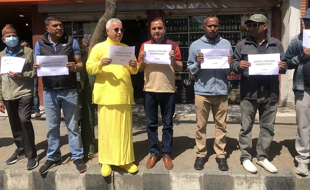 विहिअब्र अमेरिकाः आक्रमणकारी भुमिका बन्द गर, अरु देशको सार्वभौमसत्ताको सम्मान गर, इजरायलः बर्बरता र आक्रामकता बन्द गर । शान्तिपूर्ण सहअस्तित्वको मार्ग अवलम्वन गर, इरानः आणविक महत्वाकांक्षा परित्याग गर, आफ्नै नागरिक माथि दमन र अत्याचार बन्द गर भन्दै  काठमाण्डौ महाराजगन्जस्थित अमेरिकी राजदूतावास र लाजिम्पाटस्थित इजरायली राजदुतावास अगाडि विहान  र दरवारमार्गस्थित इरानी कन्सुलेट कार्यालय अगाडि मध्यान्ह आधा घण्टा प्रदर्शन भएको थियो ।