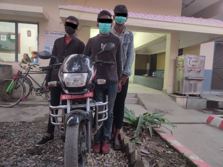 बीरगंज, ११ फागुन । वीरगञ्ज महानगरपालिका वडा नं.६ बस्ने बर्ष २४ को शुभम शर्माको ना. ४३ प. ३४४ नम्बरको कालो रातो रंगको १२४.७ CC को सुपर स्पलेण्डर मोटरसाइकल शनिबार दिउँसो ०३:०० बजेको समयमा वीरगंज महानगरपालिका कै वडा नं. ०६ स्थित सडकको छेउमा पार्किङ गरी राखिएको अवस्थामा चोरी भएकोमा अनुसन्धानको क्रममा उक्त मोटरसाइकल चोरी गरी वीरगञ्ज महानगरपालिका वडा नं.१६ बस्ने बर्ष २१ को संजय कुमार सर्राफको घरमा लुकाई राखेको खूल्न आएकोले निजको घरबाट सो मोटरसाइकल बरामद गरी चोरीमा संलग्न बीरगंज महानगरपालिका वडा नं.१६ बस्ने बर्ष २१ को संजय कुमार सर्राफ, वडा नं. ०२ बस्ने बर्ष २० को असरफ अलि र बर्ष २० को चुनचुन बाबु राउत लाई नियन्त्रणमा लिई पर्सा जिल्ला अदालतबाट पाँच दिनको म्याद लिई अनुसन्धान भइरहेको कुरा जिल्ला प्रहरी कार्यालय, पर्सा का सूचना अधिकारी प्रहरी नायब उपरीक्षक ओमप्रकाश खनालले बताएका छन् ।