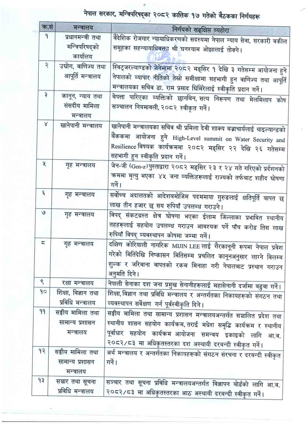मन्त्रिपरिषद्को बैठकले गत भदौ २३ र २४ गते भएको जेनजी आन्दोलनको क्रममा ज्यान गुमाएका ४५ जनालाई शहिद घोषणा गर्ने निर्णय गरेको छ । त्यस्तै बैठकले विपद संकट ग्रस्त घोषणा गरिएको जिल्ला इलमलाई ५ करोड ३० लाख रकम निकासा गर्ने निर्णय समेत गरेको छ ।