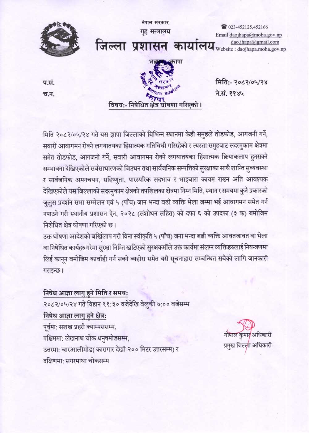 जिल्ला प्रशासन कार्यालय झापाले बिर्तामोड र दमक आज बिहान साढे १० देखि बेलुका ७ बजेसम्मका लागि कर्फ्यु लगाएको छ भने भद्रपुरमा बिहान साढे ११ बजेदेखि सांझा ७ बजेसम्म निषेधाज्ञा जारी गरिएको छ । सो अवधिमा तोकिएको सो क्षेत्रभित्र प्रदर्शन, बैठक, घेराउ गर्न नपाइने सूचनामा उल्लेख छ ।