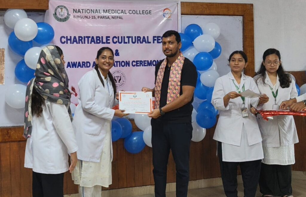 वीरगञ्ज, ०७ असोज । नेशनल मेडिकल कलेज तथा शिक्षण अस्पतालमा “Charitable Cultural Fest & Award Affiliation Ceremony” भव्यतापूर्वक सम्पन्न भएको छ ।कार्यक्रमको उद्देश्य चिकित्सा शिक्षा मात्र नभई समाजसेवा, सिर्जनात्मकता र नेतृत्वतालाई प्रोत्साहन गर्ने रहेको आयोजकले जानकारी दिएका छन् ।