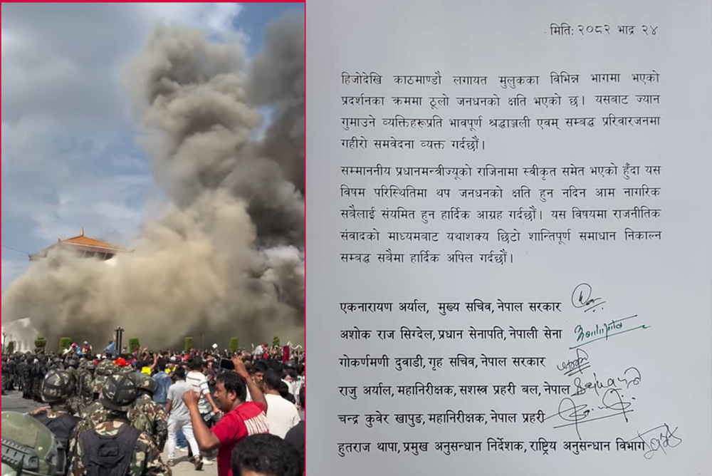 मुख्यसचिव एकनारायण अर्याल, प्रधान सेनापति अशोकराज सिग्देल, गृहसचिव गोकर्णमणी दुवाडी, सशस्त्रका आईजीपी राजु अर्याल, नेपाल प्रहरीका आईजीपी चन्द्रकुवेर खापुङ र राष्ट्रिय अनुसन्धान विभाग प्रमुख हुतराज थापाले अपिल जारी गर्दै राजनीतिक संवादको माध्यमबाट समाधान निकाल्न आग्रह गरेका हुन।