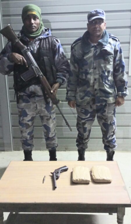 बीरगंज, २२ फागुन । पर्सा जिल्लाको छिपहरमाई गाउँ पालिका-०५ सिक्टापुल स्थित सशस्त्र प्रहरी बल, बि.ओ.पि. भिष्वाबाट शनिबार राति १०:४५ बजेको समयमा सशस्त्र प्रहरी निरिक्षक राजेश्वर प्रसाद साहको कमाण्डमा खटिएको ७ जनाको गाडी मोबाईल टोलिलाई देख्नासाथ सिक्टापुल बाट भारत तर्फ पैदल जादै गरेको एक जना ब्यक्तिले आफुले बोकेको झोला सोही स्थानमा फालि ब्यक्ति भारत तर्फ भागिगएको हुदाँ उक्त झोला चेकजाँच गर्दा झोला भित्र प्लास्टिकमा बेरिएको लागु औषध (चरेश) जस्तो देखिने २ पाकेट लागु औषध, कटुवा पेस्तोल थान – १ र उक्त पेस्तोलमा प्रयोग हुने ७.६२ एम. एम. राउण्ड थान -१ फेला परेको हुदाँ उक्त लागुऔषध र हतियार बरामद गरी ईलाका प्रहरी कार्यालय पोखरियामा बुझाइएको कुरा सशस्त्र प्रहरी बल नेपाल नं. १३ गण, पर्सा का गणपति सशस्त्र प्रहरी उपरीक्षक तेज प्रसाद पोखरेल ले बताएका छन् ।