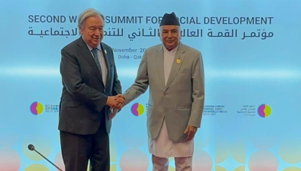 कतारका अमिर शेख तमिम बिन हमद अल थानीको निमन्त्रणामा नेपाली प्रतिनिधिमण्डलको नेतृत्व गर्दै कतारको राजधानी दोहामा मंगलबारदेखि सुरु भएको ‘सामाजिक विकासका लागि दोस्रो विश्व शिखर सम्मेलन’मा सहभागी हुन आएका राष्ट्रपति पौडेल र संयुक्त राष्ट्र संघका महासचिव गुटेरेसबीच भेटवार्ता भएको हो ।