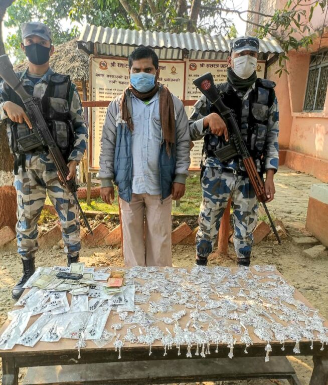 बीरगंज, ११ फागुन । सशस्त्र प्रहरी बल छिन्नमस्ता बाहिनी मुख्यालय मधेश प्रदेश बाट खटिएको स्क्वाड टोलीले मंगलबार दिउँसो करिब ०२:२० बजेको समयमा ३ किलो तैयारी चाँदीको गहना र नगद सहित एक भारतीय लाई आफ्नो नियन्त्रणमा लिएको छ । सशस्त्र प्रहरी बल का मधेश प्रदेश प्रमुख डीआईजी गणेश ठाडा मगर ले दिनु भएको जानकारी अनुसार उक्त दिन भारतको बिहार राज्य, जिल्ला मधुबनी थाना रामनगर ग्राम पंचायत आमाद-१२ बस्ने बर्ष ३८को रंजित राय लाई सिरहा जिल्लाको दुर्गा मन्दिर बाट सो परिमाणको गहना, भा. रु. २२ हजार २ सय, ने. रु. ५ सय १० तथा ९८२६७१९६६७ नम्बरको मोबाइल फोन १ थान समेत तैयारी चाँदीको रु. १ लाख ५० हजारको मूल्य राखी आवश्यक कारवाही को लागि लहान भन्सार कार्यालयमा बुझाइएको छ ।