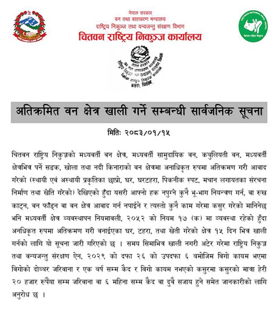 निकुञ्ज कार्यालयले वन क्षेत्रभित्र अनधिकृत रूपमा बनाइएका घर, टहरा, गोठ, पर्खाल, खेतीपाती लगायतका संरचना १५ दिनभित्र खाली गर्न र तोकिएको समयभित्र अतिक्रमण नहटाएमा कानुनी कारबाही गरिने चेतावनी पनि दिइएको छ ।